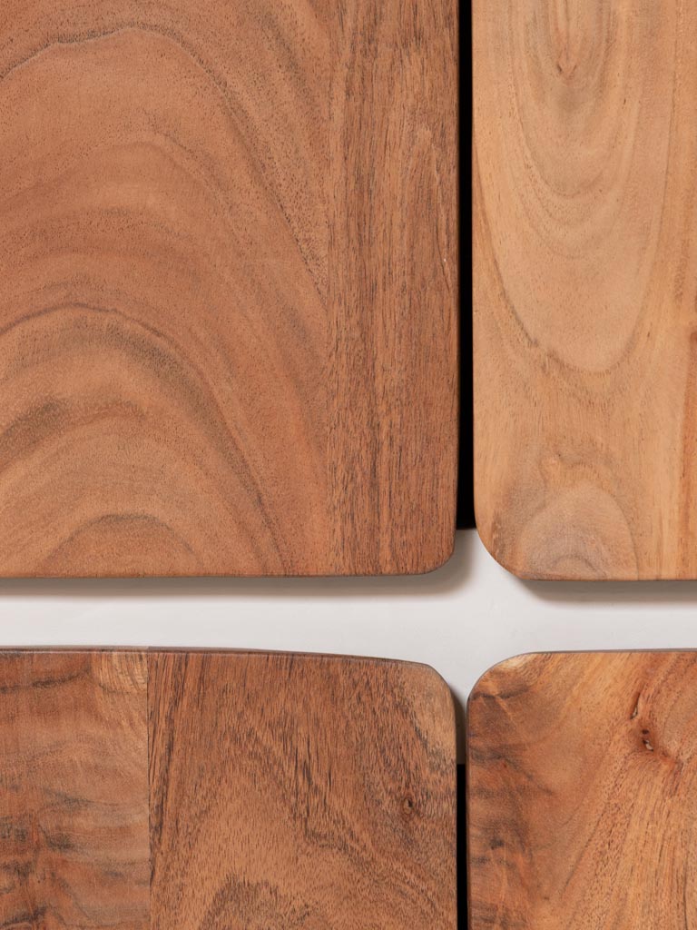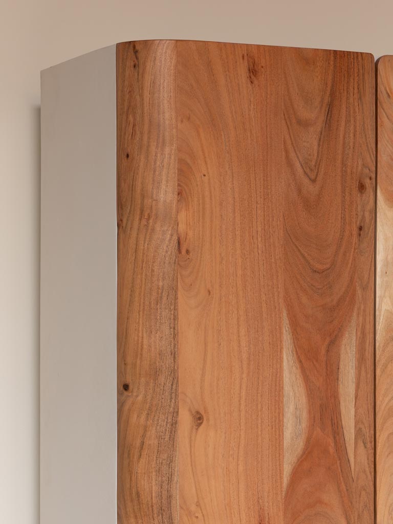 De plus, cette alliance de bois nobles et de tons patinés s’intègre à merveille dans une déco vintage, où le passé converse harmonieusement avec le moderne. Le manguier offre densité et motifs veinés marqués, l’acacia illumine de ses reflets dorés, et le blanc mat tempère l’ensemble pour une atmosphère lumineuse et fluide. Les portes ornées de sculptures subtiles rappellent les buffets provençaux ou les meubles anciens, réinterprétés avec des quincailleries en métal patiné. Elle se marie aux sols en carrelage, murs de pierre brute ou tissus lin usés. Ainsi, elle élève les rangements en véritable œuvre décorative, alliant praticité et chaleur esthétique narrative.