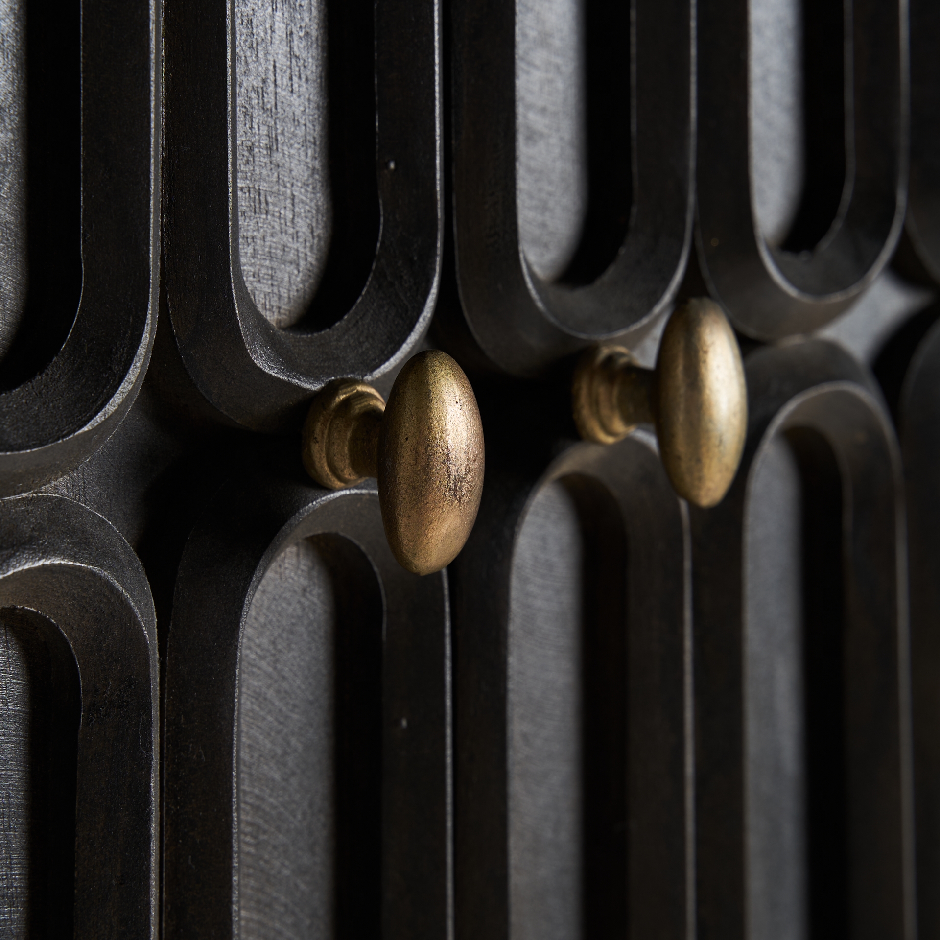 Le mariage du métal et du bois de manguier offre à l’armoire Emly un équilibre entre robustesse et design. Les détails en laiton apportent une touche de raffinement, tout en contrastant avec les tons noirs et dorés. Ce choix de matériaux confère au meuble un aspect à la fois industriel et chaleureux, parfait pour un intérieur au style rétro ou moderne. Chaque modèle de la série Emly propose une combinaison unique de ces éléments, permettant ainsi de trouver le meuble qui s’adapte le mieux à votre espace.