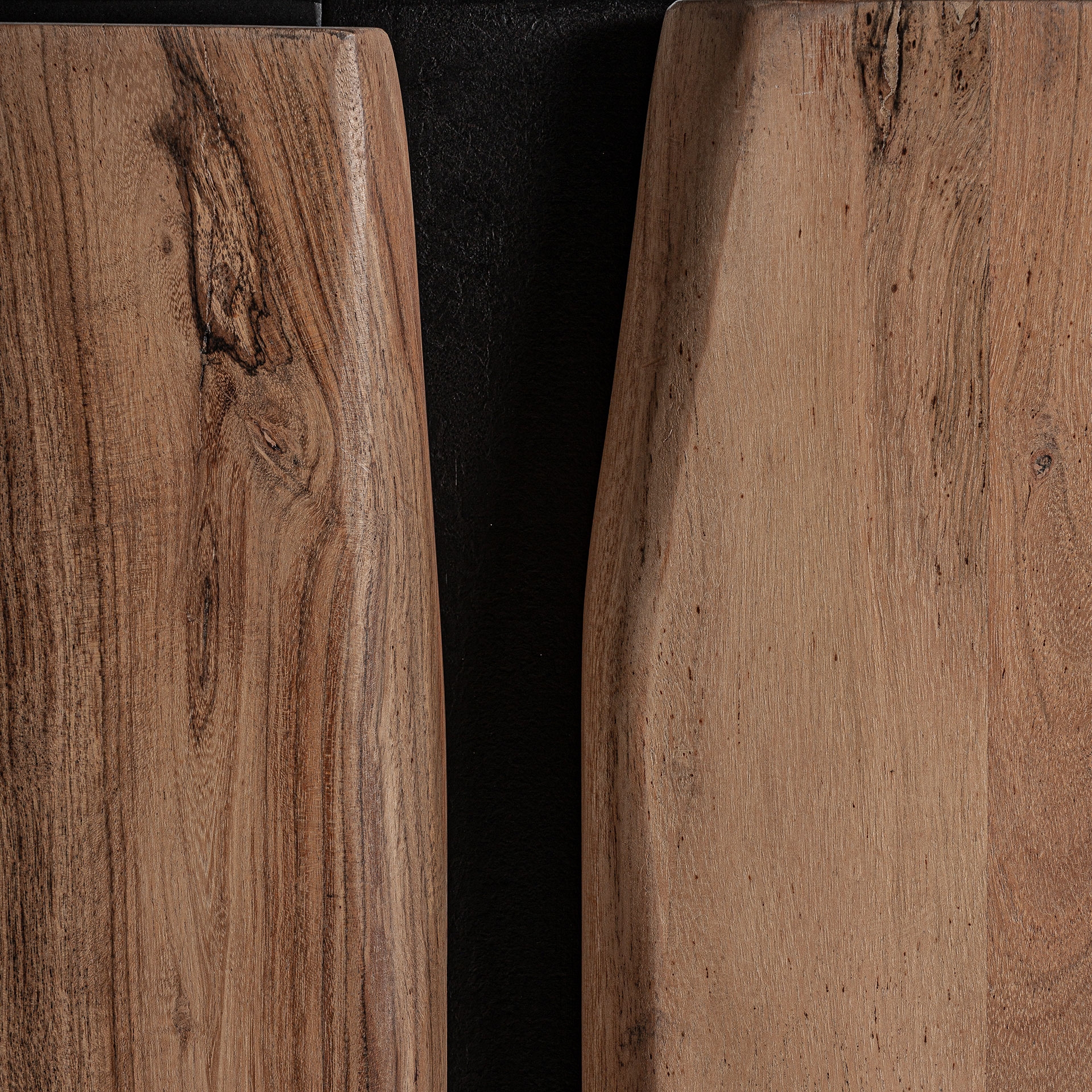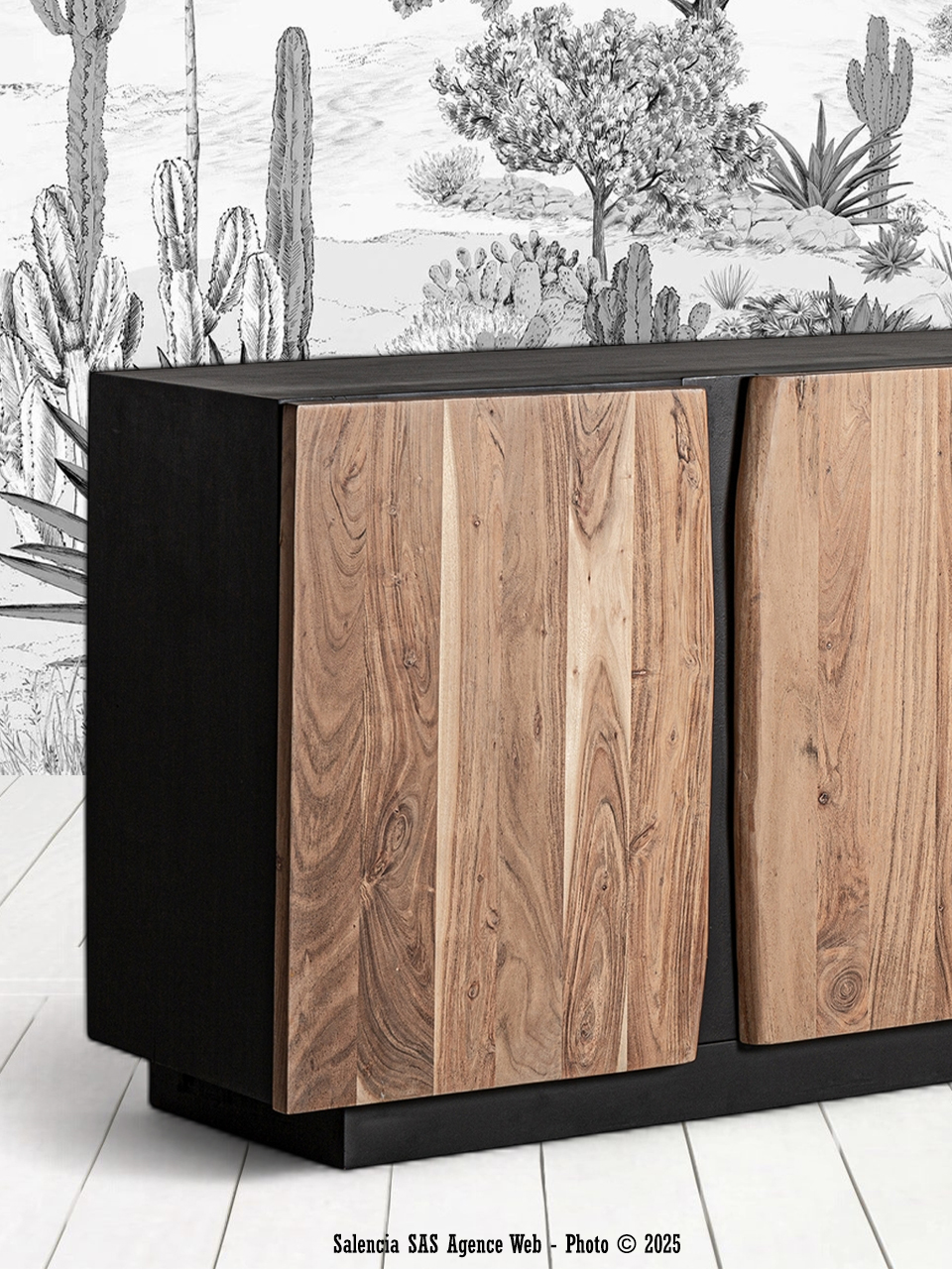 Le buffet Kerken de Vical est une pièce maîtresse qui allie le style art déco à une élégance sobre et raffinée. En effet, ce meuble se distingue par sa capacité à marier des matériaux et des couleurs contrastés, créant ainsi une harmonie visuelle unique. D’une part, sa structure en bois d’acacia confère une solidité et une texture qui s’intègrent parfaitement dans des intérieurs de caractère. D’autre part, le métal utilisé dans sa conception ajoute une touche de modernité et de robustesse, tout en accentuant le côté industriel du design. Par ailleurs, le choix des couleurs, avec un marron chaleureux et un noir profond, renforce l’aspect sophistiqué du meuble. Ce contraste est encore sublimé par des touches de doré, qui apportent une note de luxe discrète mais efficace.