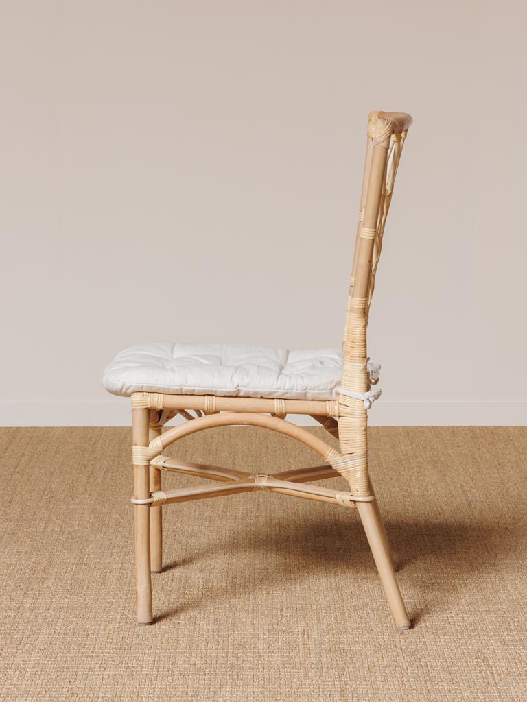 La couleur beige naturelle de la chaise Croisillons s’harmonise avec une variété de styles de décoration, apportant une touche de sérénité et de simplicité à tout environnement. Que ce soit dans un salon, une véranda ou une salle à manger, cette chaise s’intègre parfaitement à votre décoration naturelle, créant une ambiance apaisante et relaxante.