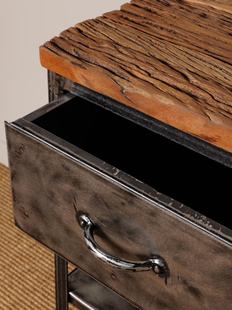 Le chevet 1 tiroir Oregon de la marque Chehoma est un meuble qui allie fonctionnalité et esthétique dans un style industriel chic. Fabriqué en bois recyclé et métal, ce chevet se distingue par sa construction robuste et son design soigné.