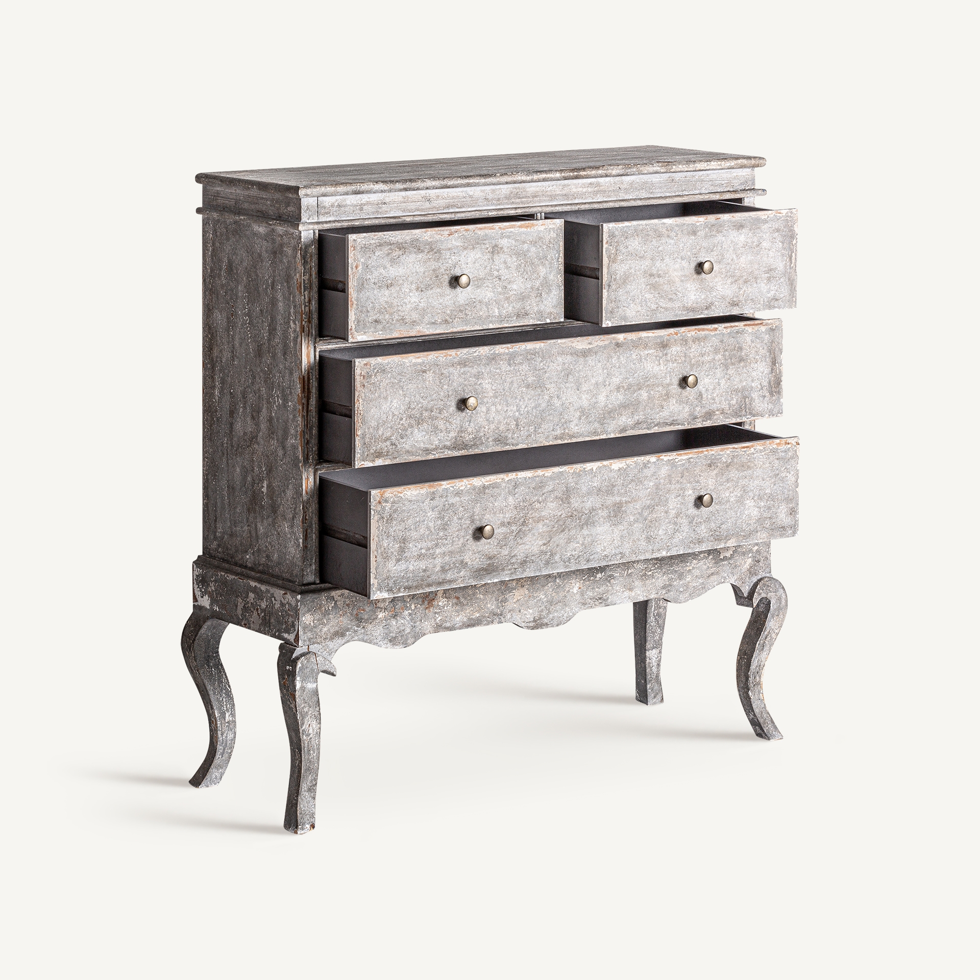 La commode Formelle de VICAL réinterprète le style provençal avec une finition grise vieillie qui met en valeur le grain du bois de sapin. Dès lors, elle s’impose comme un choix incontournable pour ceux qui souhaitent apporter une touche de charme à leur intérieur. En effet, ses lignes douces et sa présence apaisante en font une pièce idéale pour les chambres en quête de chaleur et de romantisme intemporel. De surcroît, cette commode ne se contente pas d’être fonctionnelle ; elle est également un élément clé pour une décoration réussie. Ainsi, elle s’intègre harmonieusement dans divers styles d’ameublement, qu’il s’agisse d’un cadre moderne ou d’une déco brocante.