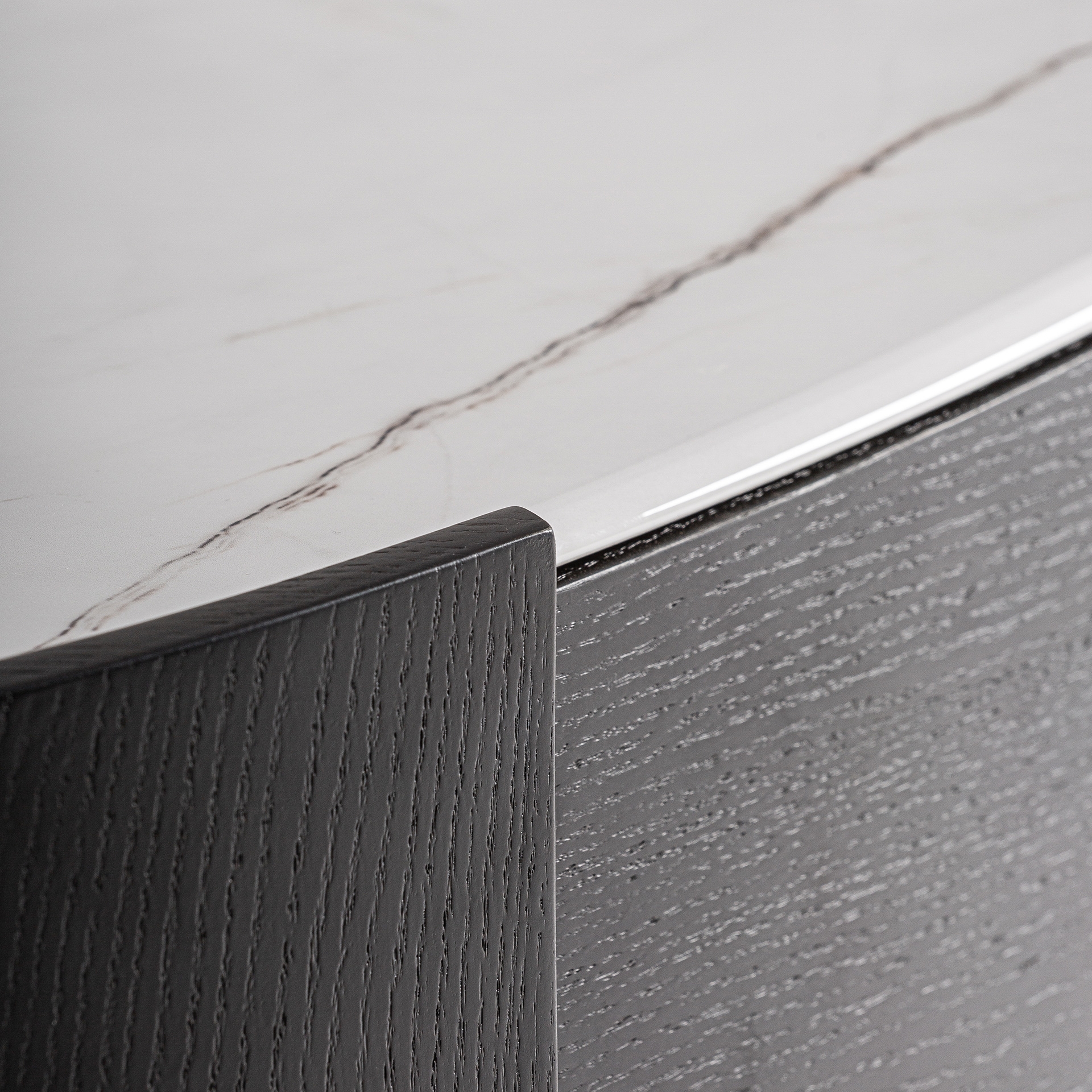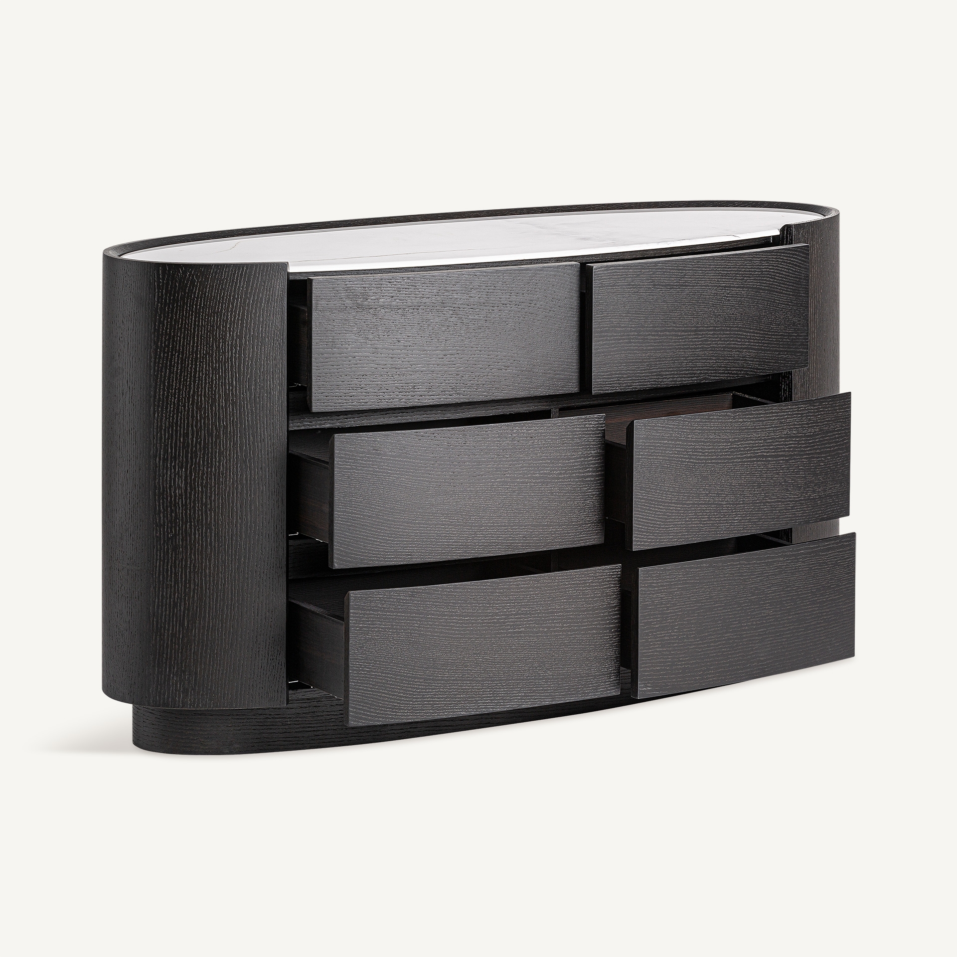 La commode Isola de Vical se distingue par son contraste visuel et son design contemporain. D’abord, sa structure en contreplaqué noir associée à une surface en pierre frittée blanche confère à cette pièce un caractère unique. Ensuite, le choix des matériaux et des couleurs, notamment le chêne et le doré, permet d’intégrer cette commode dans divers environnements, que ce soit dans une chambre moderne ou un espace plus classique. De plus, la sobriété de sa forme, alliée à la richesse de ses textures, offre une esthétique raffinée et intemporelle. Par conséquent, la Commode Vical devient un élément central qui attire le regard tout en restant fonctionnel.