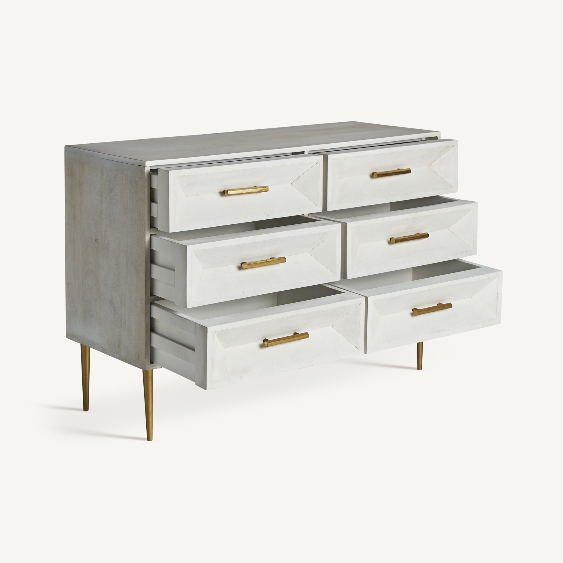 Avec son design intemporel, la commode Kempten s’intègre parfaitement dans divers styles de décoration, tout en étant particulièrement idéale pour ceux qui apprécient le style vintage. Ses tiroirs spacieux et pratiques permettent de ranger vos objets personnels tout en conservant une ambiance ordonnée et élégante dans votre chambre, salon ou entrée. Le contraste subtil entre le manguier et les détails en métal doré accentue le côté chic de cette pièce, tout en mettant en avant la beauté naturelle du bois.