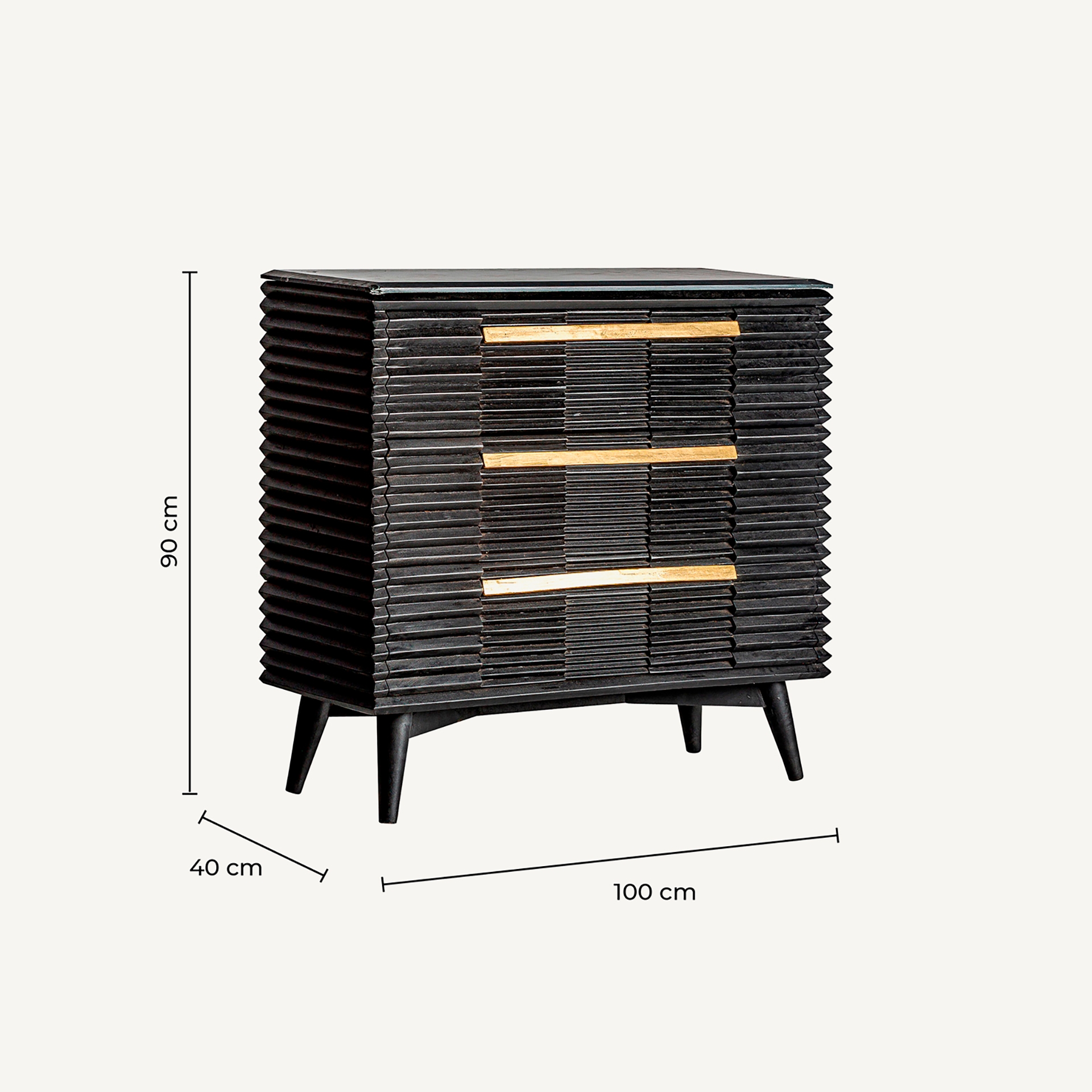 La commode Plissé Wood Black de la marque Vical est un véritable bijou de design, associant le charme du manguier au caractère audacieux du métal et la noblesse du marbre. Sa finition en noir profond, élégante et moderne, lui permet de s’intégrer harmonieusement dans une décoration au style vintage. Ce meuble se distingue par son esthétique raffinée et sa grande fonctionnalité, en faisant un élément décoratif clé dans votre espace.