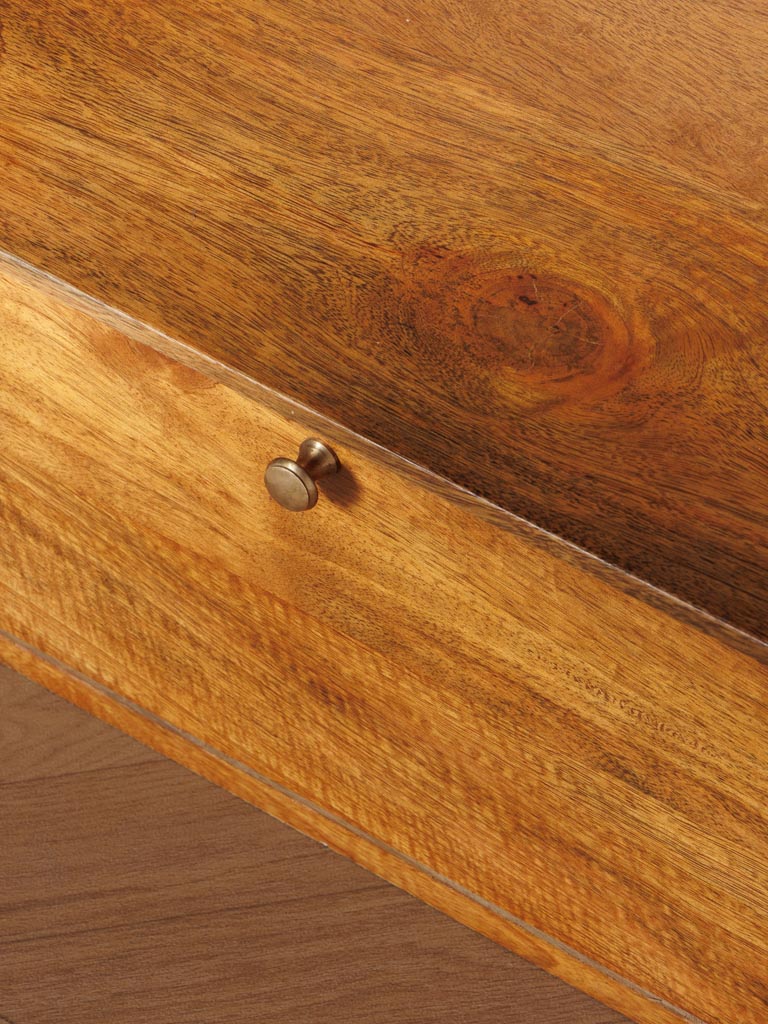 Avec sa structure en manguier massif, cette étagère assure robustesse et longévité tout en ajoutant un cachet naturel à votre décoration. Son bois légèrement texturé et ses finitions soignées rappellent l’authenticité des meubles artisanaux, parfaits pour créer une atmosphère harmonieuse et accueillante. Son tiroir aux lignes épurées est idéal pour ranger des accessoires tels que des clés, des carnets ou des objets précieux tout en gardant un espace ordonné. Associée à d’autres éléments en bois ou en matériaux naturels, elle s’intègre parfaitement dans une ambiance inspirée d’un voyage lointain ou d’un intérieur au style bohème. Son design sobre mais travaillé permet de l’accorder avec différents styles, du classique au plus contemporain.