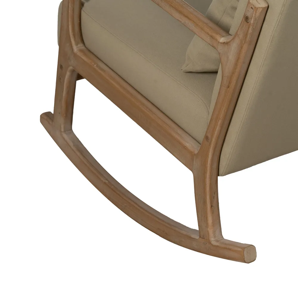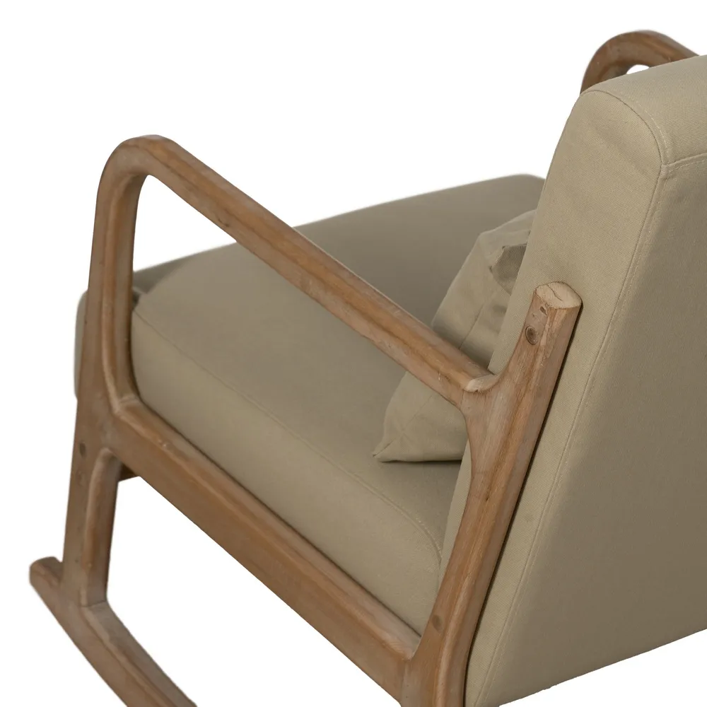 Fabriqué en hévéa, ce fauteuil présente une structure robuste et durable qui garantit une excellente stabilité. Son assise et son dossier, recouverts de coton beige, offrent une sensation agréable au toucher et un soutien parfait. Grâce à ses accoudoirs bien étudiés et son système de balancement fluide, il procure une assise reposante et apaisante.