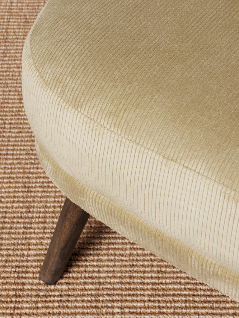 Sa couleur beige douce et chaleureuse offre une palette neutre et versatile, idéale pour s’adapter à divers styles de décoration. Les côtes du tissu ajoutent une texture intéressante et un aspect confortable à ce fauteuil, renforçant son attrait vintage.