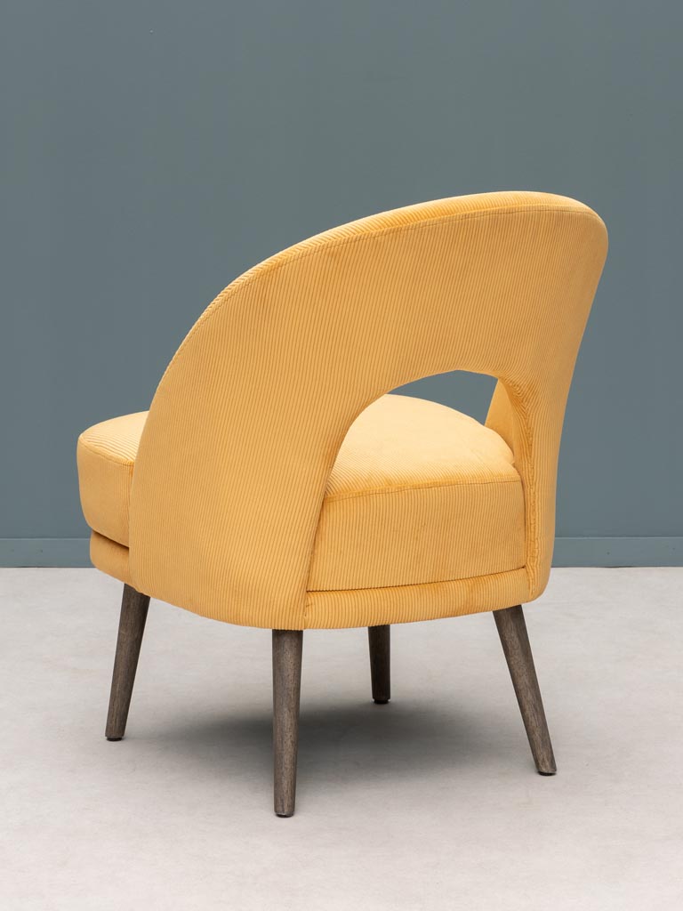 Sa couleur jaune ocre apporte une touche de chaleur et de vitalité à votre espace, évoquant les nuances vibrantes des décennies passées. Les côtes du tissu ajoutent une texture unique et un confort supplémentaire à ce fauteuil, renforçant son charme vintage.