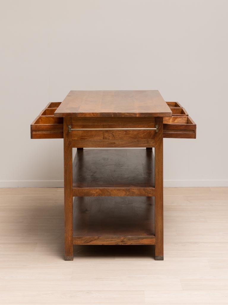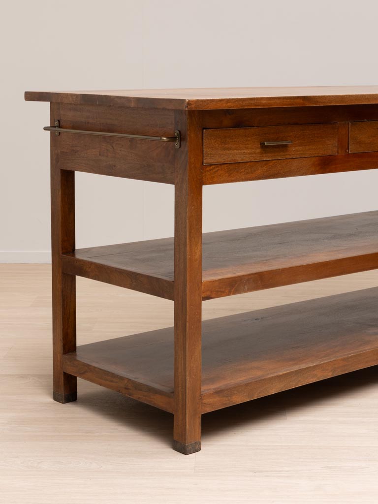 Grâce à ses six tiroirs spacieux, cet îlot Chehoma offre un espace de rangement généreux pour organiser efficacement tous vos ustensiles et accessoires de cuisine. Il est idéal pour ceux qui apprécient un plan de travail dégagé tout en ayant tout à portée de main. En outre, la combinaison harmonieuse du manguier et du métal confère à ce meuble une durabilité sans compromis, tout en lui permettant de résister aux usages intensifs d’une cuisine active. Cet îlot, véritable pièce maîtresse, est à la fois robuste et élégant, apportant un équilibre parfait entre style et praticité.
