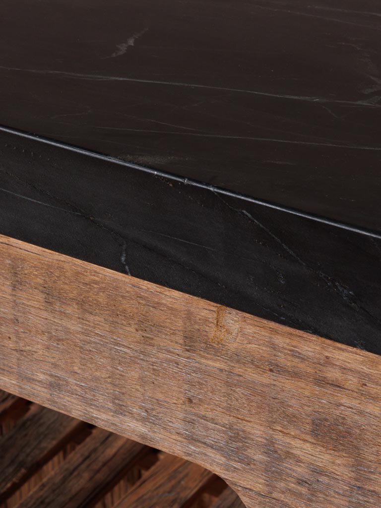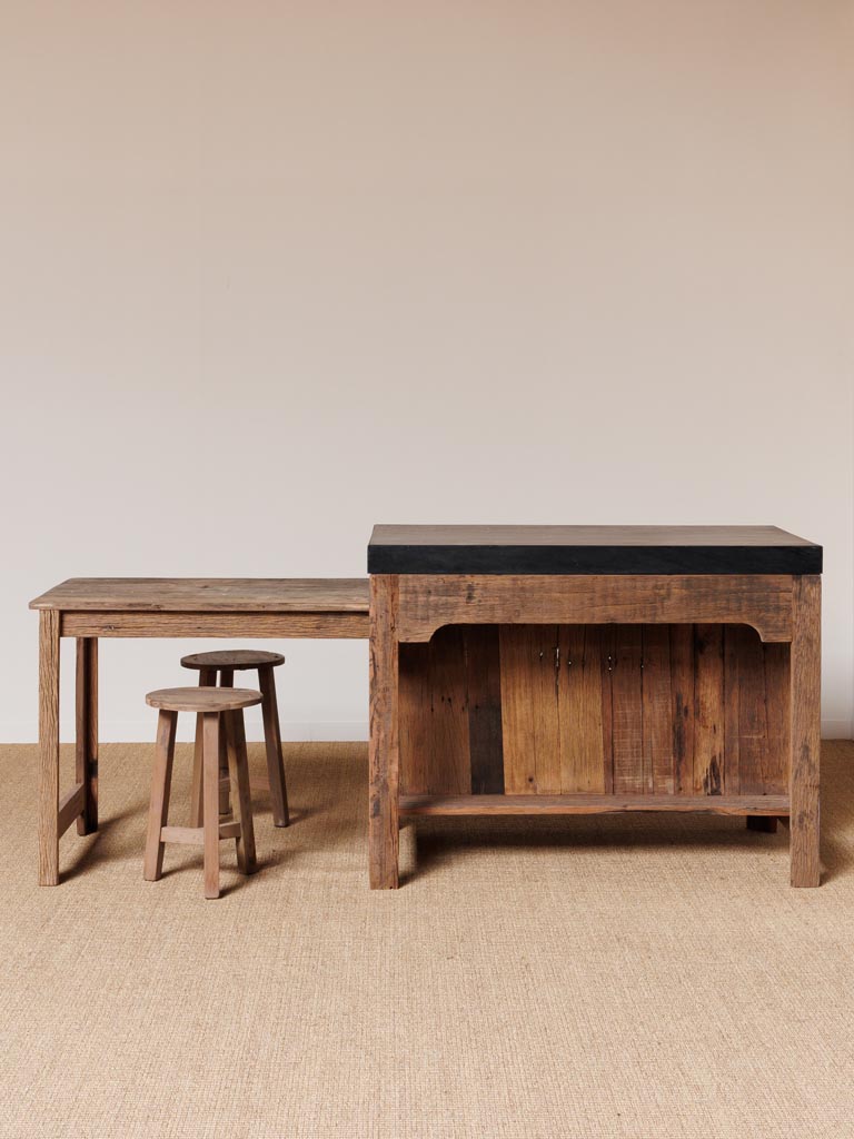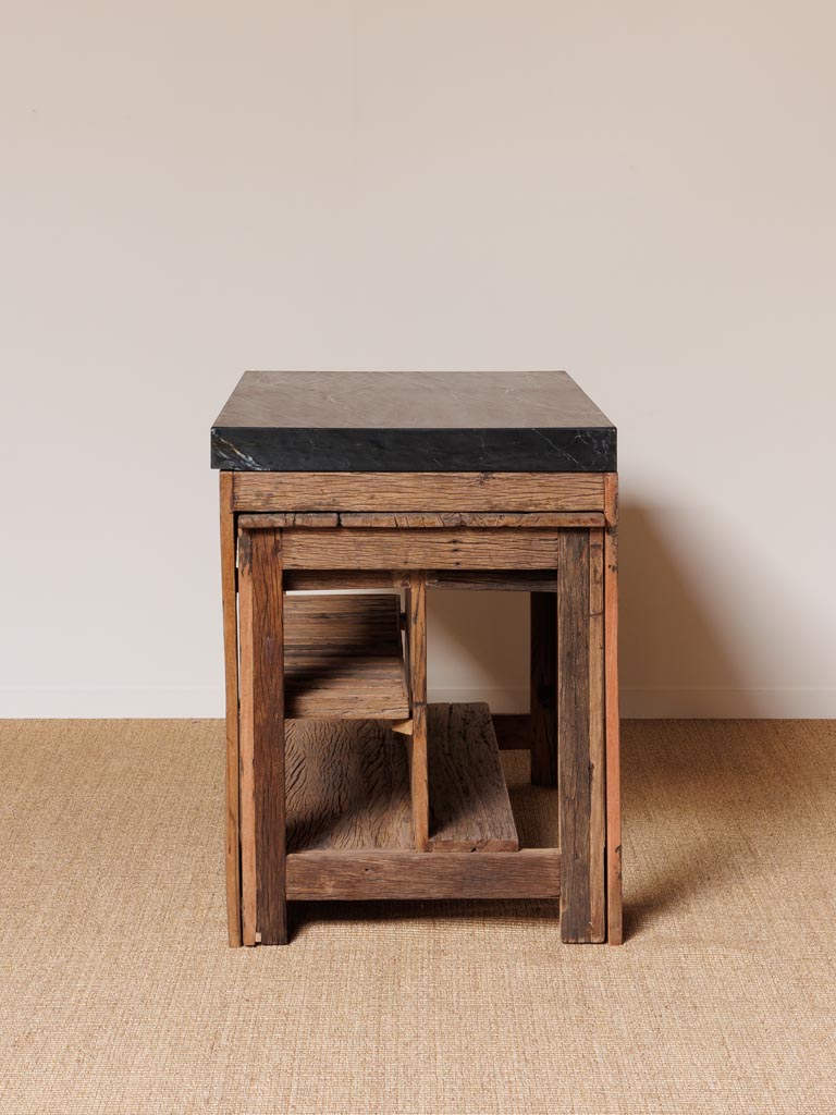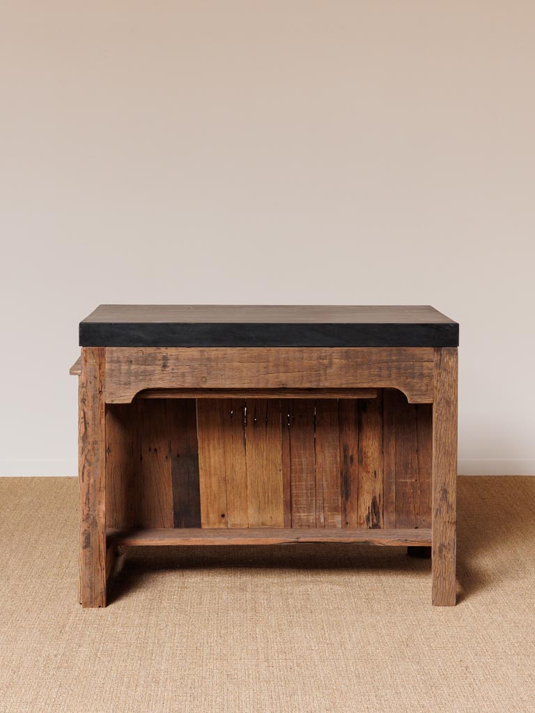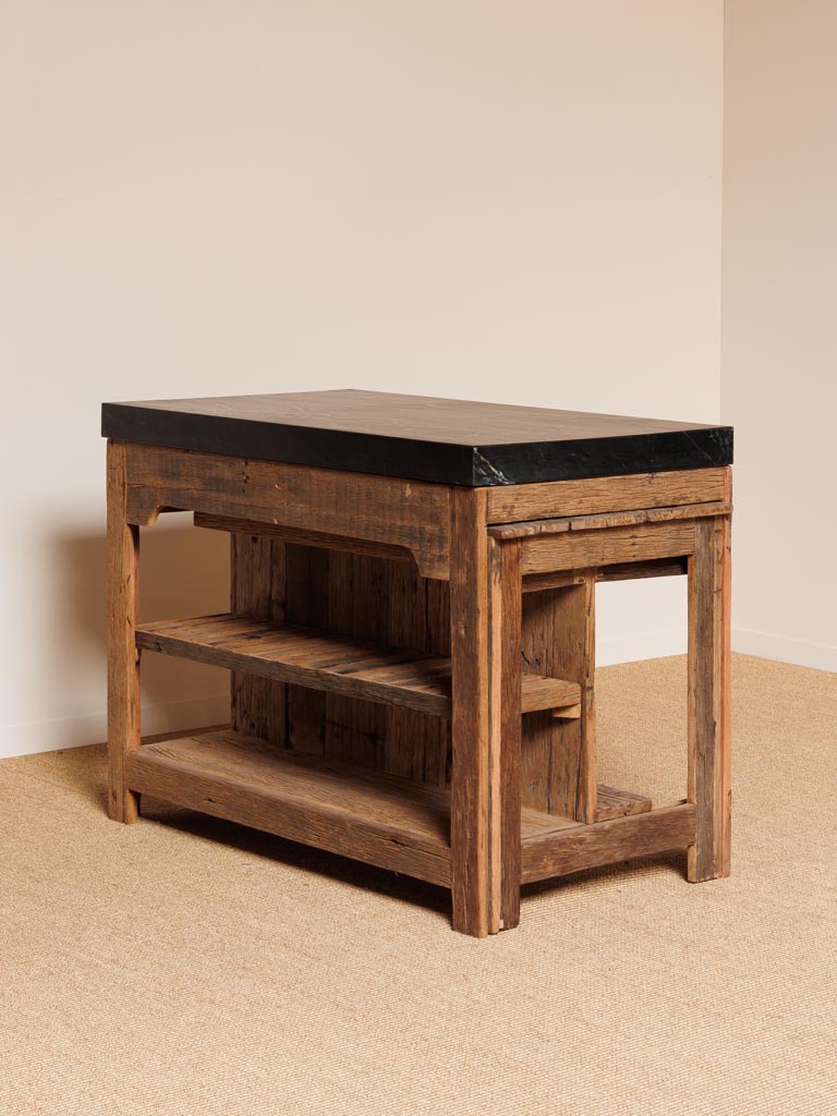 Le marbre noir confère à cet îlot de cuisine Chehoma un aspect noble et intemporel, tandis que le bois recyclé apporte une touche chaleureuse et naturelle. La partie coulissante est un atout majeur, vous permettant d’agrandir la surface de travail ou de repas en un clin d’œil. Cela le rend idéal pour les cuisines ouvertes ou les espaces multifonctionnels où l’optimisation de l’espace est essentielle. Le contraste entre le marron du bois et le noir profond du marbre crée un effet visuel saisissant, ajoutant à la fois caractère et sophistication.