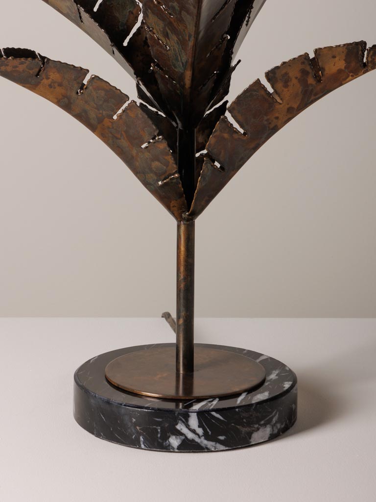 Grâce à son design inspiré de la nature, la lampe base marbre noir Hostoa s’intègre aussi bien dans un univers contemporain que dans une décoration plus exotique. Ses feuilles finement sculptées confèrent une présence raffinée, évoquant une immersion au cœur d’un jardin tropical. Son abat-jour en lin tamise la lumière avec délicatesse, diffusant une atmosphère apaisante dans la pièce. Placée près de matières naturelles comme le bois, le rotin ou le bambou, elle renforce le charme organique de votre espace tout en conservant une élégance intemporelle. Son pied en marbre assure stabilité et durabilité, garantissant une pièce aussi esthétique que fonctionnelle.