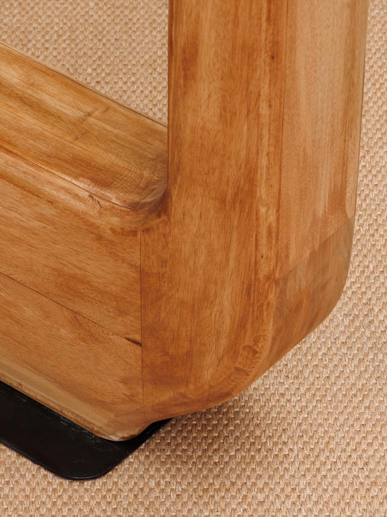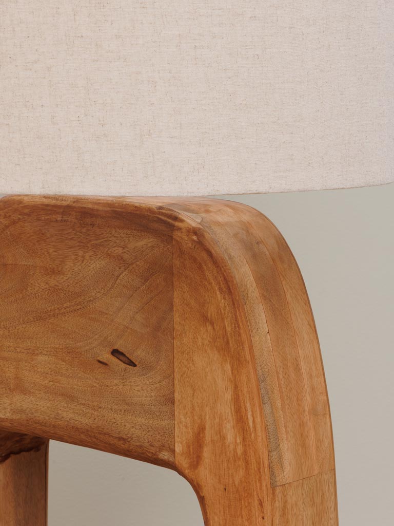 Le pied élancé en manguier, au ton marron profond, donne à l’ensemble une assise naturelle et pleine de caractère. Il évoque les meubles artisanaux travaillés dans des essences nobles, avec une finition brute qui valorise le grain du bois. En contraste délicat, l’abat-jour associe deux matières textiles essentielles : le lin et le coton, pour une lumière filtrée apaisante. Leur tissage simple laisse passer une clarté douce, parfaite pour instaurer une ambiance feutrée dans une chambre ou un salon. Ces matériaux naturels, associés à une structure solide, confèrent à cette lampe un style à la fois sobre et singulier. Elle s’intègre facilement dans une pièce au mobilier en bois clair, aux tapis en fibres ou aux objets d’inspiration artisanale.