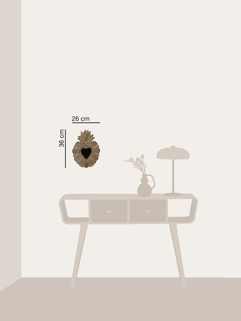 Par ailleurs, le miroir Ex-voto coeur et flammes se distingue par la richesse de ses matières et de ses détails. Son encadrement en Métal présente un relief finement dessiné : flammes élancées, petits picots et contours irréguliers donnent du rythme à la surface. La finition délicatement Doré évoque les objets précieux patinés par le temps, comme s’il s’agissait d’une relique dénichée dans une brocante ou un grenier. Le cœur central, avec son Miroir brillant, contraste avec cette patine dorée légèrement vieillie et renforce la profondeur de l’ensemble. Accroché au‑dessus d’une console garnie de fioles, de livres anciens, de fossiles ou de petits animaux naturalisés, il s’intègre naturellement à une déco cabinet de curiosités en y apportant lumière et verticalité.
