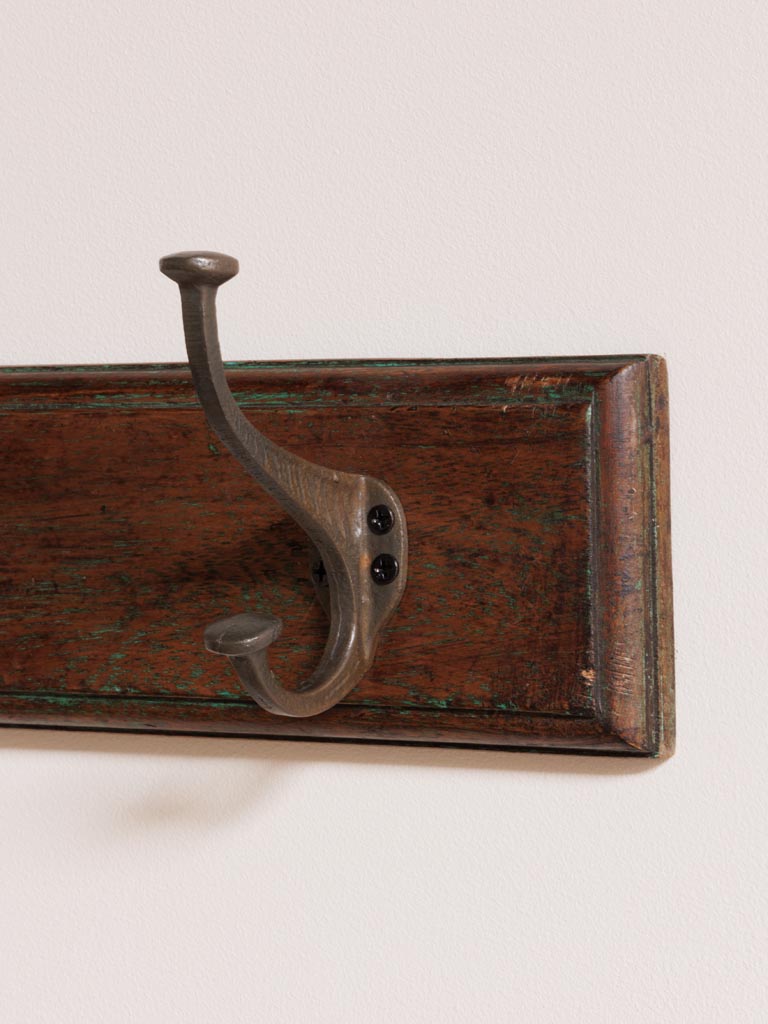 Avec ses trois crochets en métal patiné et robustes, ce porte-manteau allie style et fonctionnalité. Il offre un espace de rangement pratique pour suspendre manteaux, sacs ou accessoires. La structure en manguier, résistante et élégante, garantit une durabilité optimale tout en apportant une chaleur naturelle à votre décoration murale.