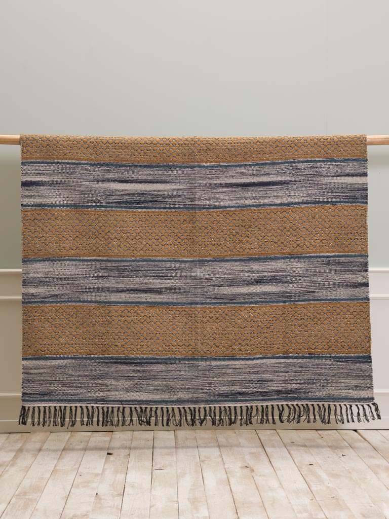 En coton avec une teinte dominante ocre, des imprimés et une frange bleus, on aime le style sobre de ce tapis.